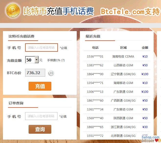 国内BtcTele.com网站的比特币充值手机话费----比特币全国直充话费支持移动、联通、电信手机话费充值,关这些字眼就能吸引不少持有比特币的人吧? 此充值网站今年6月左右运行至今,从其网站目前的充值量来看,生意可谓兴隆,笔者通过其网站了解到整个充值过程简单且快捷,不逊于各大运营商的网上营业厅,整个过程全部由系统自动进行完成,操纵起来非常方便快捷,唯一不同之处在于,只要你拥有比特币。作为国内最早将比特币应用扩散到现实生活中的一个成功案例,BtcTele.com网站的成功或许给目前中国的比特币爱好者们以及创业者们带来了新的思维、新的发展应用思路,比特币作为一种高效快捷的支付手段,其实可以影响到社会的方方面面,在国外比特币可以喝咖啡,可以买蛋糕,甚至可以买汽车和房屋,这种重量级的应用,我想随着比特币在国内的发展,指不定哪天就在我们身边出现。