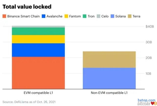 非以太坊的第 1 层的 TVL 所有第 1 层都在竞争,以吸引开发人员和用户。在没有任何以太坊的工具和基础设施 (这些工具和基础设施使构建和使用应用程序变得容易) 的情况下,实现这一目标是很困难的。为了弥补这一差距,许多第 1 层采用了一种称为 EVM 兼容性的策略。 EVM 代表以太坊虚拟机,它本质上是执行计算以使交易发生的大脑。通过使他们的网络与 EVM 兼容,以太坊开发人员可以通过复制和粘贴他们的代码,轻松地将现有的以太坊应用程序部署到新的第 1 层。用户还可以通过现有的钱包轻松访问 EVM 兼容的第 1 层,从而简化迁移。 以币安智能链 (BSC) 为例。通过发布一个 EVM 兼容的网络,并调整共识设计以实现更高的吞吐量和更便宜的交易,BSC 在去年夏天 DeFi 应用程序的使用量激增,这些应用程序都类似于 Uniswap 和 Curve 等流行的以太坊应用程序。Avalanche、Fantom、Tron 和 Celo 也采取了相同的方法。 相反,Terra 和 Solana 目前不支持 EVM 兼容性。