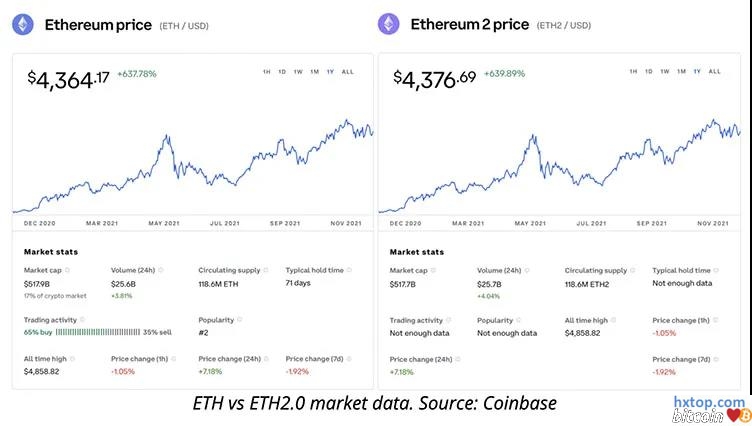 就在12月10日的关键网络升级之前,加密货币交易所Coinbase在其加密货币价格指数中加入了以太坊区块链原生代币以太(ETH)的镜像版本。 这个版本被称为“ETH2”,似乎一直在同步追踪原始的ETH市场数据。例如,购买ETH2的费用与ETH的费用相同。同时,两者的市值、交易量、流通供应和价格变化也是相同的。
