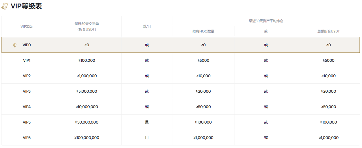 VIP级别划分也更加人性化,用户在过去30天里的交易量,或者在虎符交易所中的资产持仓量,都可以作为划分VIP等级的标准。无论是喜欢做波段的用户,还是囤币用户,都有机会享受相应级别的VIP权益。