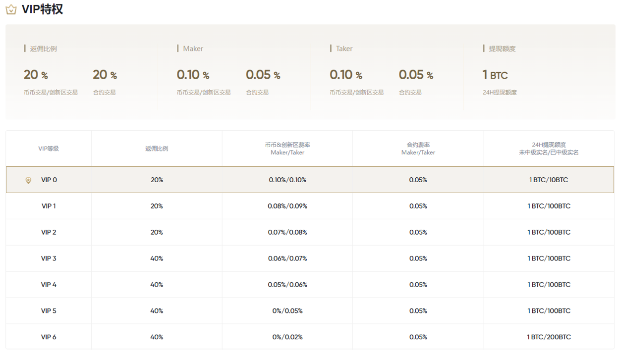 11月,虎符调整了交易手续费率及VIP等级划分方法,基础手续费率从0.2%下调为0.1%,这应该是全网最低水平。升到VIP 6可免Maker手续费。
