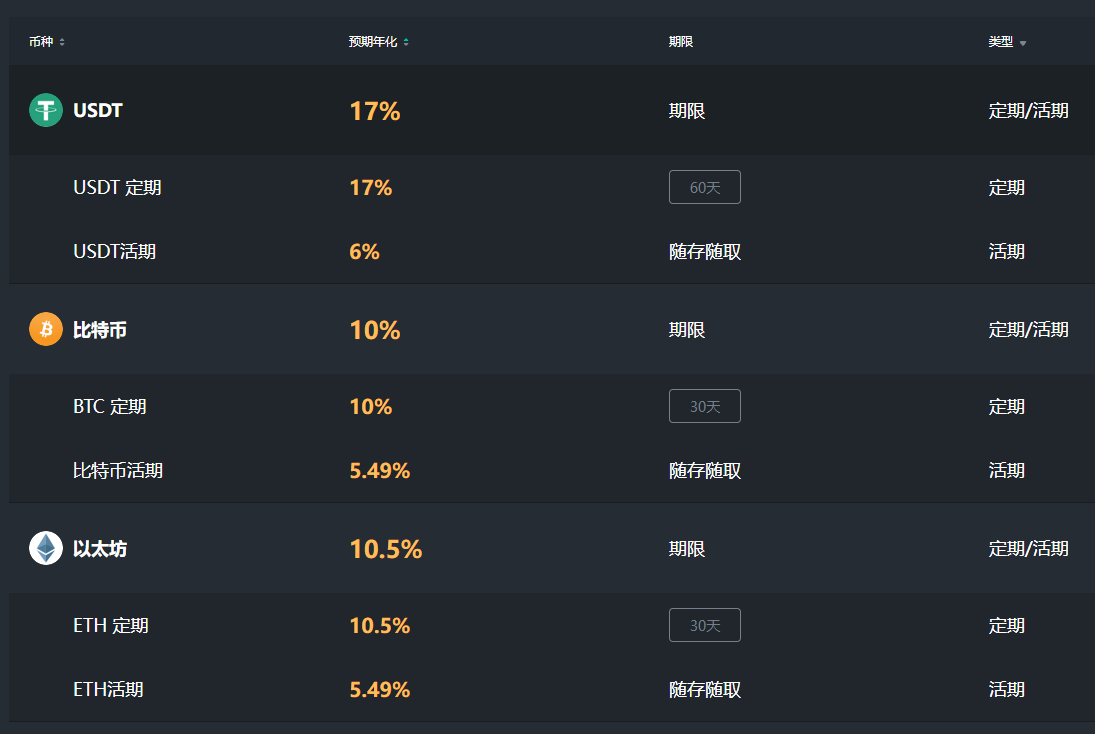 这是虎符金融的稳健型品,包括活期和定期两种。虎符官方数据:虎符赚币已安全运行三年,参与人数超过9万,累计参与资产超过47亿USDT,为用户带来超过7,000万USDT的收入。