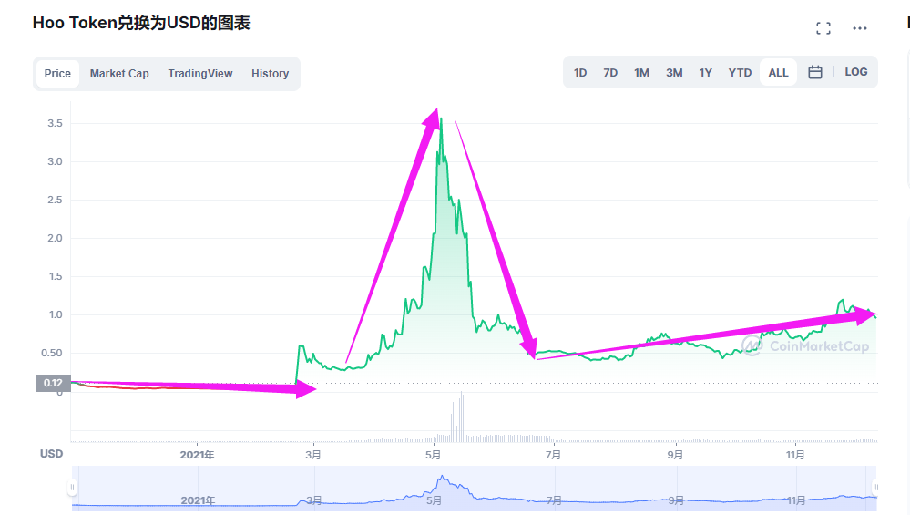 第2阶段——疯狂阶段,2021年3~7月,随着币市的波动,HOO进入了疯狂阶段,在5月达到3美元,随后恢复理性。