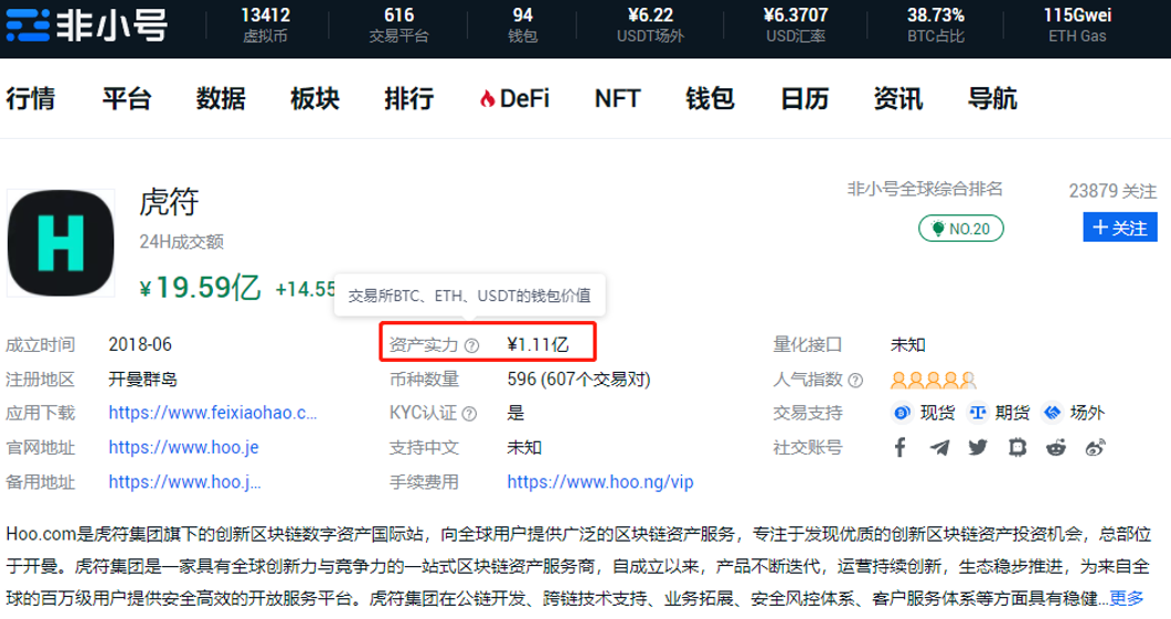 在各项评级内容中,虎符表现较好,只有资产实力一项略低于行业平均值。然而,非小号是通过链上数据,汇总各交易所钱包中BTC、ETH和USDT3种币的总价值。虎符的交易所钱包中,这三种币的总价值为1.11亿元人民币,首先这个规模并不少。