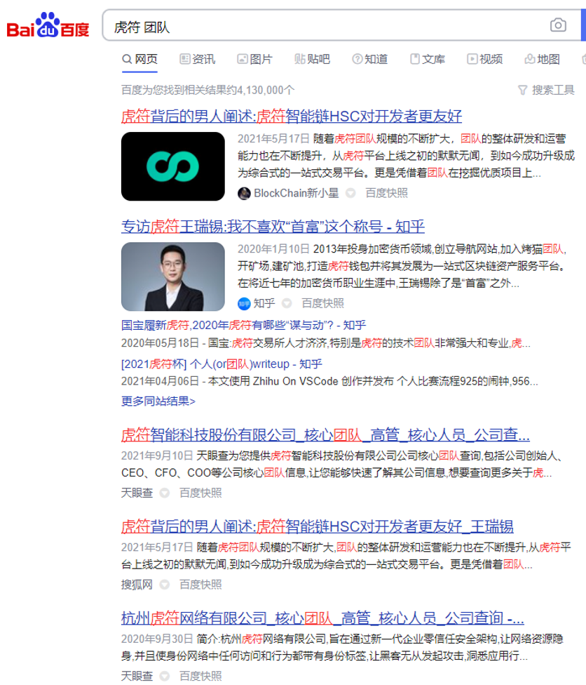 在百度上搜索“虎符 团队”,可以查到很多信息,可以看见虎符的创始人和背景信息。不同于某些创始人匿名的平台,虎符坦荡面对市场。