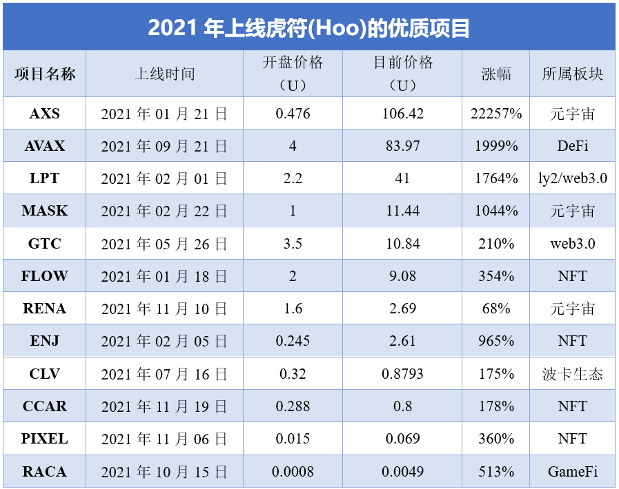虎符敏锐地在较早期发现优质币,包括Defi、NFT、元宇宙、GameFi等热门板块,即使目前行情回落,仍然有不菲的收益率,其中一些优势项目的表现如下: