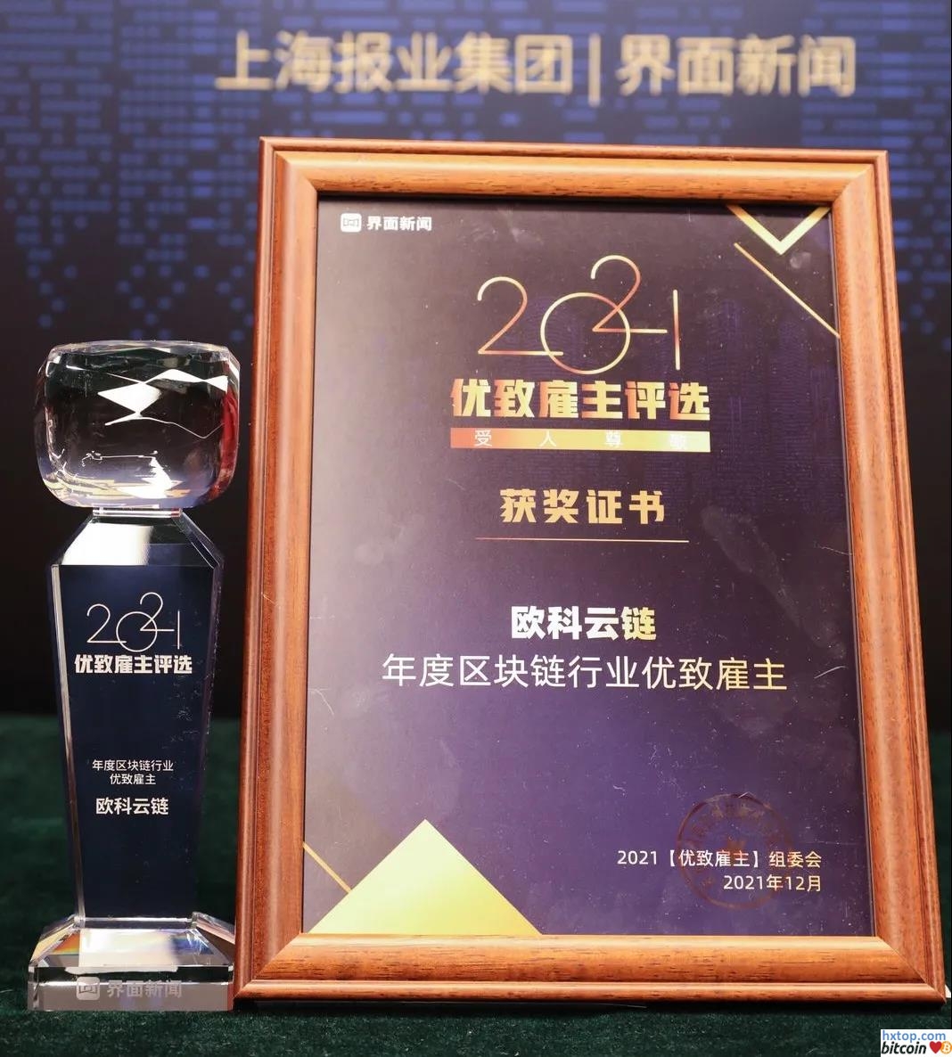 12月15日,第四届【界面财经年会】在上海成功举办。 论坛现场揭晓了2021年度【优致雇主】终榜名单,欧科云链在此次评选中荣膺2021“年度区块链行业优致雇主”,成为区块链领域唯一获奖的企业。