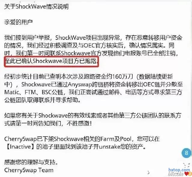 在种种成熟的证据链下,公安民警于2021年6月底在成都将胡某和杨某纤2人依法逮捕。经过多次、反复地审讯,成功拓展线索,将从犯杨某、敖某洋等6人,制作“盛大合约”APP公司相关负责人杨某良、朱某兵2人,虚拟币商3人及若干涉案人员共计24人全部捉拿归案。 目前,相关人员已被依法移送起诉,案件仍在进一步审理中。 5、原子币 多次暴雷的“原子币”现在都还在顶风作案,在国家严打之下,都还能各种阴谋和套路,不得不说是名“战士”,而之前就有用户举报,称北京原子恋科技有限公司即将解散,目前正在申请注销登记阶段,疑似即将关网跑路。 6、shockwave 樱桃官方倒是发了一则公告,证实shockwave项目方确实已跑路,可是这样就能撇清关系吗?所以说对于这样的平台,大家在上面玩的时候还是要谨慎些,一不小心就被坑的血本无归。