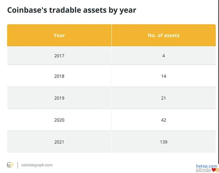 截至目前,Coinbase有139种可交易资产。2021年,该交易所在其交易列表中增加了多达83种资产,几乎是其成立八年来积累的资产数量的两倍。 这种快速扩张只是一种简单的“吸金策略”吗?那些不太知名的代币中是否有证券?这种行为是不负责任还是野心膨胀?Coinbase资产的快速扩张意味着什么?