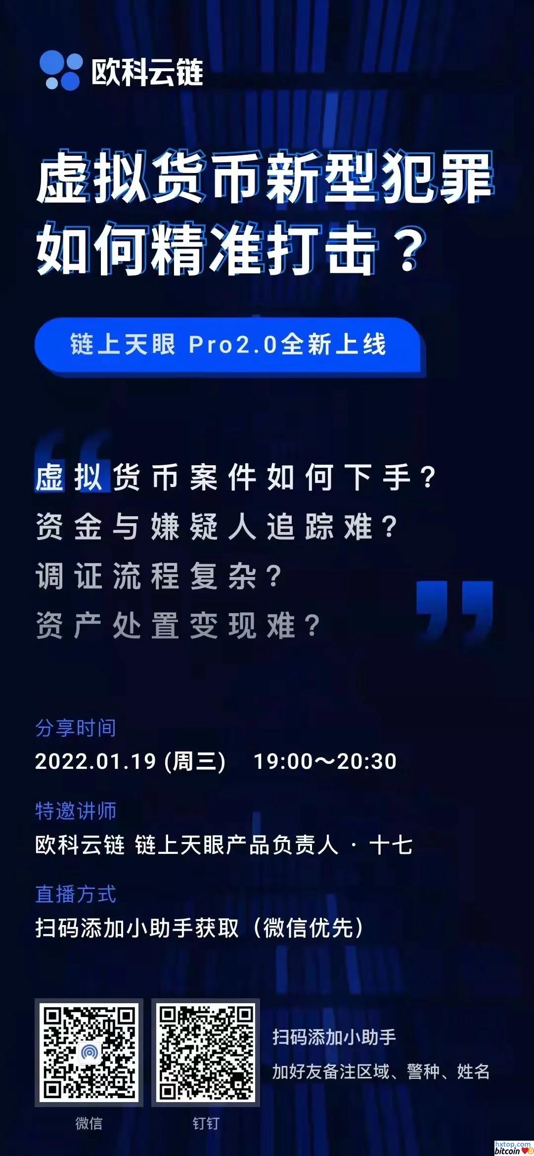 近期,链上天眼Pro2.0因荣登央视、中国警察网点赞、协助四川眉山公安破获1700万诈骗案,吸引了一众媒体与一线警务人员的关注。 据统计,仅2021年链上天眼团队已协助全国各地警方打击各类虚拟货币案件近百起,协助追回资产300多亿元。 近年来,我国虚拟货币类新型违法犯罪案件开始呈现涉案金额巨大化、涉案人员信息匿名化、通联与交易信息网络化等特点。很多一线警务工作者在面对涉及区块链虚拟货币犯罪案件时,经常会遇到以下四个难题: 1 区块链新型经济犯罪手段认知成本高 2 由于区块链的匿名账户体系,背后实体难以锁定,涉案资金链上追踪难 3 链上信息交易复杂,调证难 4 缺少涉案资产的托管、处置、变现渠道 为解决这些难题,我们凭借多年深耕区块链大数据、智慧助警、科技强警等领域的经验,自研出的“助警黑科技”:链上天眼,旨在协助一线警务人员将办案过程中遇到的难题,以可视化的形式呈现。 同时为贯彻落实党的十九大精神和习近平总书记在网络安全和信息化工作座谈会上重要讲话的要求,执行中央政法委关于推进建设智慧警务的指示,结合警务信息化实战需求,我们近年来不断免费面向警务人员举办线上/线下培训业务交流会,满足警务信息化实战需求,提高一线公安干警的侦查能力,与政府、行业、警务机关共同承担“打击犯罪”的使命。 1月19日,欧科云链「2022年首场警务实战分享」即将拉开帷幕。欧科云链产品首席负责人“十七”将携全新升级的“链上黑科技”:链上天眼Pro2.0,普及区块链和数字货币基础知识,为一线民警带来关于最新的虚拟货币新型犯罪侦破思路!