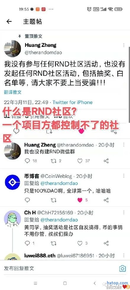 而且有人发现昨晚有一笔8888USDT的钱打到 rnd 的合约地址上,追其根源,是从okex交易所转出来的。有人猜测是OK给小学生的奖金,或者是OK奖励给小学生的。毕竟数额这么有寓意。 这位小学生也没有想到,就随便发了一个币,做测试用。没想到竟被炒火了,而且还真有人真金白银的来买。可把小学生给吓坏了,连着发了多条声明,称没有参加任何RND社区活动,任何买卖与自己无关。 虽然小学生小,但是法律意识还是有的。毕竟在国内发币是违法的。而且这个币还被大家炒的这么火热。一旦被别有用心的人控制,以后利用其来割韭菜,你说这个责任应该算谁的?