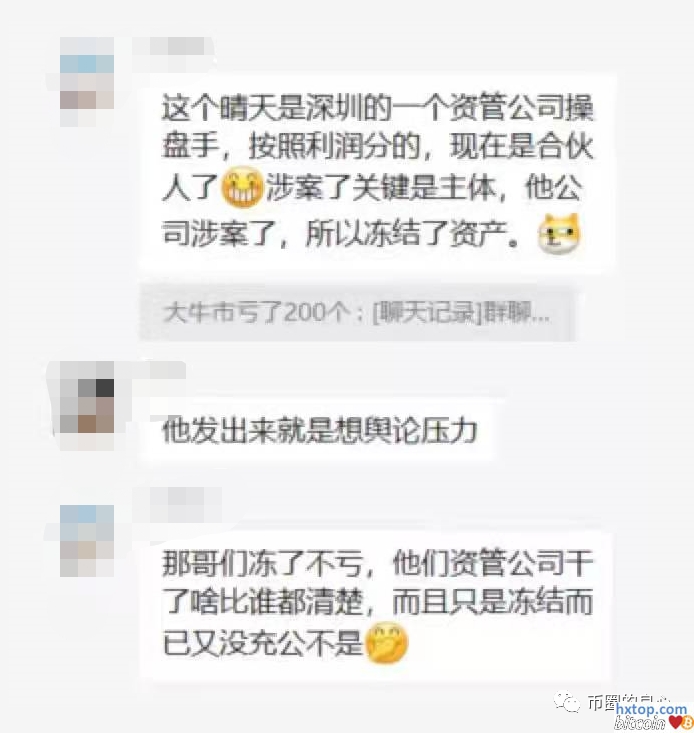 这段聊天记录的可靠性尚待查验,但似乎可以解释为什么晴天对于自己账户的资金被冻结反应那么大——可能这个钱不是他自己的,而是客户的。 |