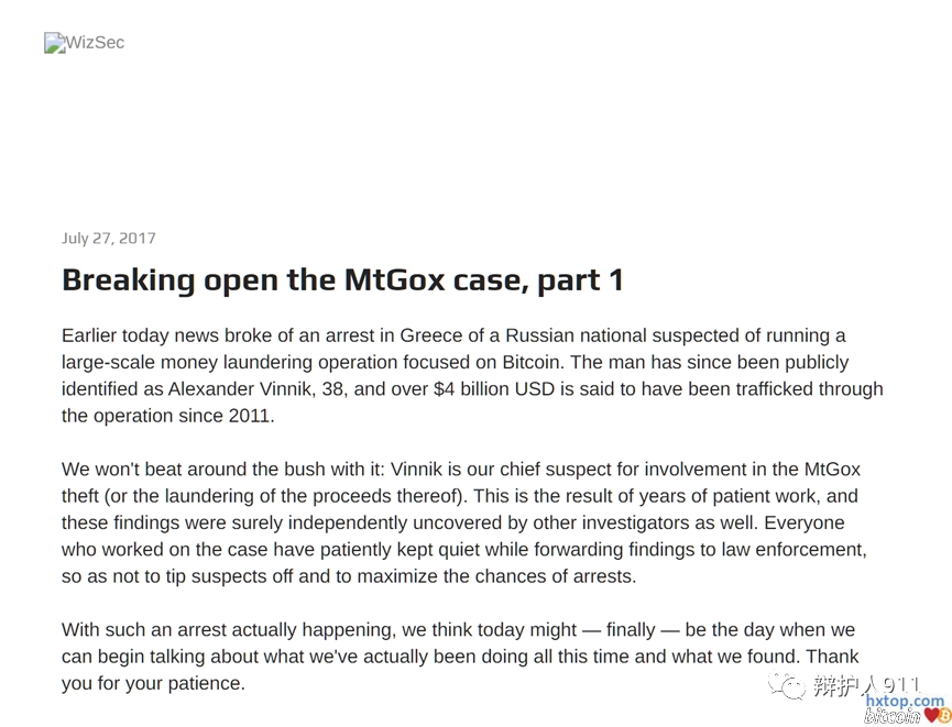 案发后,受害人之一,瑞典人尼尔森(Kim NILsson)在日本专门建立了一个调查该案的公司WizSec,并在博客上不断更新调查进度。2018年2月,WizSec公布一项重大调查结果:在分析了交易所200万条数据之后,发现“门头沟”交易所失踪的比特币大部分流向了另一个比特币交易所BTC-e,还有一些回流到“门头沟”交易所的一些账户中。(https://blog.wizsec.jp/2017/07/breaking-open-mtgox-1.html)