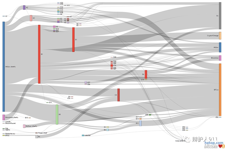 接下来,作案者再把众多二级三级节点中的比特币汇入各个交易所,比如BTC-e、Ox、Bitcoinica等。