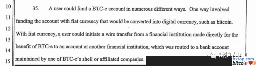 用户无法通过银行直接向BTC-e交易所账户注资,用户使用美元等法定货币注资的话,资金会被银行转到BTC-e开设的空壳公司账户,用户的BTC-e账户里会出现等值的比特币等虚拟货币。