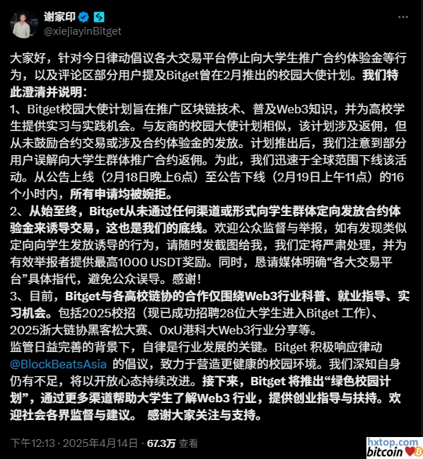 随后,Bitget华语负责人谢家印很快进行了回应与澄清,表示Bitget校园大使计划旨在推广区块链技术、普及Web3知识,并为高校学生提供实习与实践机会,未通过任何渠道或形式向学生群体定向发放合约体验金来诱导交易。在谢家印的评论区下,也有不少曾参与活动的人士对其表达了肯定,澄清了Bitget活动的正当性。