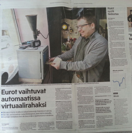 2014 年 3 月 31 日,LocalBitcoins ATM 运营商 Cointter 发推称在芬兰赫尔辛基的 24 小时售货亭 Delish 中推出第一台测试版 LocalBitcoins ATM。这是北欧第一台双向比特币 ATM,可以买卖比特币兑换现金,溢价率为 5-8%,足以供运营商赚取差价。4 月 18 日,Cointter 在 Kynsilaukan 餐厅推出第二台 ATM,引起媒体关注。2014 年 8 月 11 日,LocalBitcoins.com 宣布将 LocalBitcoins ATM:s 集成到 LocalBitcoins 网站,比特币交易发生在 LocalBitcoins.com 上,ATM 只处理法币交易。 小时售货亭 Delish 的 LocalBitcoins ATM