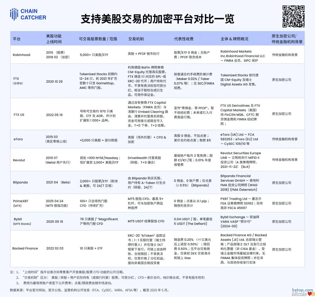但随后 KOL 加密无畏就指出 Bybit 并非其宣传的那般系全球唯一提供股票交易的加密货币交易所,一度引发社区热议。 争议一:并非全球首家支持美股交易的加密货币交易所 尽管 Bybit 在官方宣传中自称是“全球唯一支持股票交易的加密货币交易所”,但事实并非如此。 早在 2020 年,已倒闭的 FTX 就曾推出过股票代币和外汇交易服务,允许用户以加密资产间接投资美股,并通过链上代币实现映射。更早之前,eToro、Bitpanda 等平台也陆续打通了加密货币与传统证券市场之间的产品通道,虽然产品机制略有差异,但在“加密平台提供股票交易”的定位上,Bybit 属实算不上开创者。 争议二:并非买入实股,而是通过 CFD 进行交易服务 Bybit 推出的这项股票交易功能,主要是通过其 MT5 平台来为用户提供股票差价合约(CFD)交易服务。具体工作原理是:用户在 Bybit 平台内创建一个 MT5 子账户,用 USDT 为该账户注资,再在系统中以差价合约形式“交易”股票。实际上用户并不获得这些股票的所有权,也不会拥有任何股东权利。在某种程度上更像用户对价格涨跌进行下注,由平台或其合作的做市商来承担流动性角色。(经查 Bybit 官网公告,暂无明确说明由哪家做市商提供交易深度) 而关于 CFD,本质是一种衍生交易工具,全称为 Contract for Difference,即“差价合约”,允许用户基于资产价格变动进行交易,且无需持有该资产本身,这种机制在传统金融中较为常见,不过采用该机制的前提是平台必须持有相关衍生品交易牌照。 据公开信息,Bybit 目前已取得包括迪拜 VARA、塞浦路斯 CySEC、格鲁吉亚 VASP 牌照,此外,还获得哈萨克斯坦 AFSA 和阿联酋 SCA 的预批准许可,且正在法国推进 MiCA 相关申请,但已获牌照主要覆盖加密资产和差价合约领域,尚不构成对美国证券市场的合法准入。 对此,北京策略律师事务所数字经济专委会主任、合伙人律师郭亚涛律师告诉 ChainCatcher,美国现行的监管体系本身就是针对传统证券交易产品和模式设计,难以完全有效覆盖包括稳定币结算、差价合约(CFD)结构在内的新型金融产品与交易机制。在法律适用标准尚未更新的前提下,此类业务难以达到监管层面的要求,必然面临不合规的境地。 而目前,Bybit 官方公告中暂未显示关于负责承接 Bybit 股票交易业务的三方资管机构,以及具体清算路径说明等信息。 而作为平台方,公开更为清晰明确的产品机制是让用户安心的重要举措,因此 ChainCatcher 将持续关注 Bybit 后续官方公告等信息,为正在关注该产品的投资者补充相关信息。 关于加密公司涉足美股相关业务,合规仍是巨大挑战 当然,Bybit 并非个例,加密原生公司涉足传统股票、债券市场均面临合规上的挑战。 目前,加密交易所涉足传统证券市场的主流产品机制,通常并非实股持仓,而是通过前文提及的差价合约(CFD)、价格跟踪衍生品或股票代币等方式实现价格映射。 在实际操作中,不同平台根据各自的监管定位与业务模式,构建了不同的产品路径与合规策略。 比如,Robinhood,其主要依托美国本土监管体系运行,股票和 ETF 业务受 SEC 与 FINRA 监管,加密业务也取得纽约州虚拟货币牌照,其“零佣金+合规清算”的模式深受年轻用户欢迎。 而eToro 则以法币或加密货币形式支持用户投资美股、ETF、外汇等资产,且在多个司法辖区持有监管牌照,股票交易采用真实股票与差价合约(CFD)并存的模式。Bitpanda 就是通过所谓“Bitpanda Stocks”服务,为用户提供基于衍生协议的碎股交易,背后依托做市商机制进行流动性支持,且有明确标注用户并非实际持有股票,而是在参与价格追踪型金融合约。 下图则为支持美股交易的加密平台机制对比: