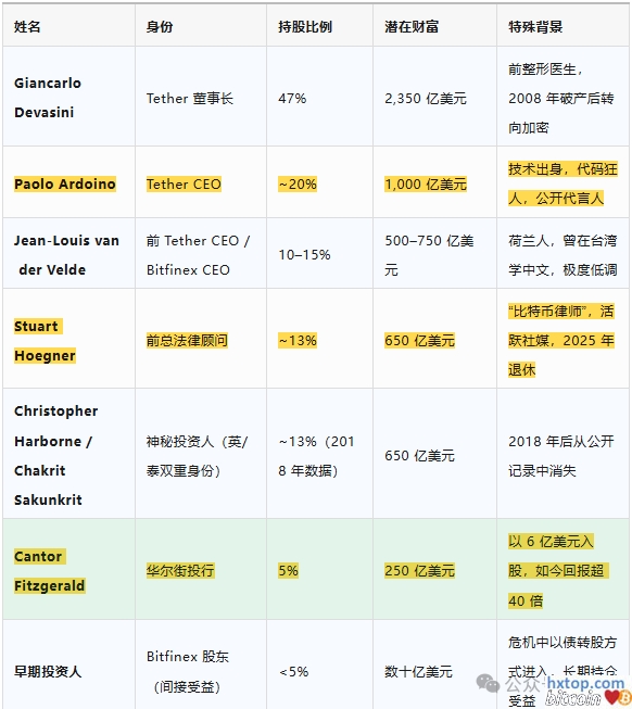 身份的多元也颇具讽刺意味。医生、程序员、律师、投行——看似互不相干的轨迹,却在 Tether 的股东名单中交织。技术、资本与合规的结合,构成了稳定币帝国的三根支柱。