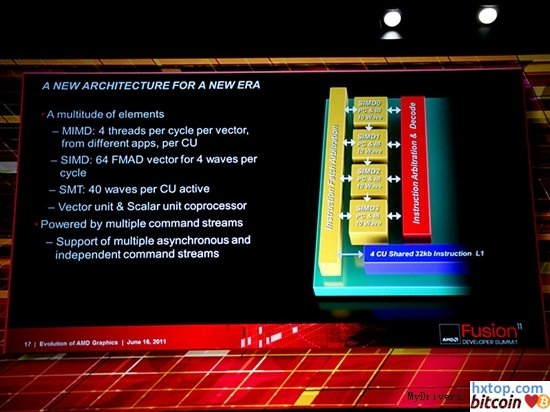 来源:驱动之家 cnbtcnews注:挖比特币的矿工们,现在开始准备好银子吧,提升45%的运算速度,而且7970不超频都有1GHZ,简直是挖矿必备终极武器。 从下周开始,AMD将在全球多个地方举办技术日会议,包括英国伦敦、法国巴黎、德国慕尼黑等等,首次官方讲解28nm Radeon HD 7000系列显卡的技术秘密。 Radeon HD 6000系列混合了VLIW5、VLIW4两种不同架构,Radeon HD 7000系列则会延续它们的同时加入真正全新的GCN,使用可处理MIMD的计算单元(CU)取代传统的SIMD阵列,大大增强并行加速计算能力,从而形成“三足鼎立”的局面。 Radeon HD 7900系列开发代号Tahiti,将会包括Tahiti XT Radeon HD 7970、Tahiti Pro Radeon HD 7950两款型号,均基于GCN新架构。 Radeon HD 7970拥有完整的32组CU,总计2048个处理核心(大致相当于传统的流处理器)、128个纹理单元、64个ROP单元,同时还有接近5MB缓存:512KB一级数据缓存、384KB共享一级缓存、2MB本地数据共享(LDS)、2MB二级缓存。虽然目前还不清楚Tahiti核心的具体规模,但即便是28nm工艺,相信核心面积也不会太小。 不止规模庞大,Radeon HD 7970的默认核心频率将会高达1GHz,成为继Radeon HD 4890之后史上第二款破“G点”的GPU,而且后者只是限量升级版,这次是全面铺开了。 显存方面也蔚为壮观:位宽拓展至384-bit,足以媲美GeForce GTX 580,同时搭配3GB GDDR5,等效频率5500MHz,带宽将达创纪录的264GB/s。 Radeon HD 7950将会减少到30组CU、1920个核心、120个纹理单元、60个ROP单元,核心频率降至900MHz,显存频率也降至5000MHz,不过目前还不确认其位宽,如果还是384-bit的话带宽将是240GB/s。 Radeon HD 7970/7950将于拉斯维加斯CES 2012消费电子大展期间发布,确切时间是2012年1月6日,价格区间为349-449美元。 向上是双芯设计的New Zealand Radeon HD 7990,将配备4096个核心、6GB GDDR5显存,而且频率也不会低,不过这款新旗舰要到2012年3月份才会推出,预计价格699美元——和现在的Radeon HD 6990相同。