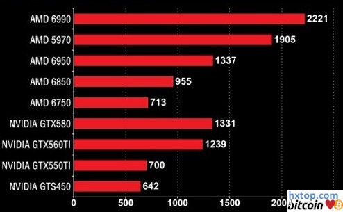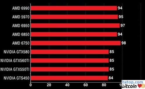 最终结果很和谐,虽然A卡的理论浮点运算能力很高,但在DirectCompute理论测试当中,同级别的A卡并不比N卡高多少。因为DirectCompute现阶段主要还是在游戏当中使用,因此意义不是很大。 Bitcoin挖矿性能测试:A卡绝对优势 如果您还不了解比特币的话,不妨看看前不久我们的评测文章《挂机也能赚钱?教你用显卡挖矿赚美元》。这里就直接引用测试数据: