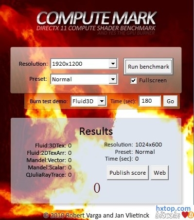 可以看出,GPU视频转码时,CPU和GPU都要参加计算,而且GPU不需要尽全力,所以高端GPU和中端GPU的性能是差不多的。总体来看N卡的CUDA性能要优于A卡的Stream性能。 DirectCompute理论性能:A卡略占优势 ComputeMark由捷克硬件和游戏网站CzechGamer.com的Robert Varga开发制作,引擎是基于Jan Vlietinck的Fluid3D Demo。软件能够使显卡占用率达到99%,而CPU占用率仅0-1%,避免由CPU性能造成对测试成绩的影响。同时该软件还有功耗测量的功能,测试时间可以随意设定。