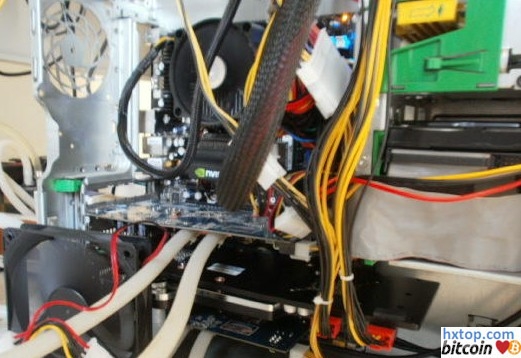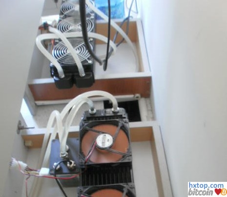 5870独享的360铝排,配两个低速风扇 NV的680i主板。上下两片七彩虹6750,中间是6990,都换了水冷,6750供电贴了散热片用风扇对着吹。电源是TT的威龙650,再并联一个光宝的OEM拆机电源,专供两张6750。 75大洋一个的一进三出快速插头,能自封的,很方便,靠它俩给二号机显卡供水 360铜排,三张显卡共享 50多元的潜水泵,扬程2米,1.4L/h 二号机运行状态,NV的主板就是热 秘密就在这里,全部显卡都满载,凉快吧.