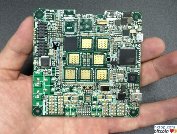 蝴蝶实验室发布了两张ASIC矿机的图片,他们的ASIC预计在今年11月底或者12月开始发货。 他们宣称$29,899版本的设备,速率是1.5T/S,功耗为1500W。上图的这个60G版本的设备,大小为92×92mm,中间有8个芯片,每个芯片的速度为7.5G/s。 下图是Bitforce SC Jalapeno 版本的ASIC设备,速率为4.5G/s。