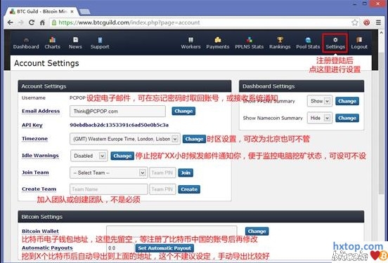 账号设置有一些注意点,电子邮件建议设定一个常用的。 然后就是比特币电子钱包地址,如果您没有固定的电子钱包,那就先不要设定,等挖到一定数量的比特币之后,再设定一次性钱包地址导出来,导出后再及时更新钱包地址。