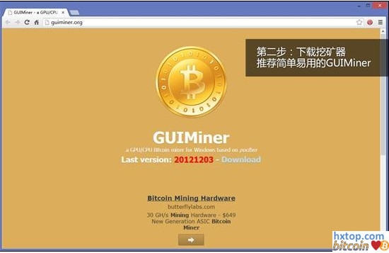 账号注册完毕,就该第二步了,下载比特币挖矿器,这里推荐小巧易用的GUIMiner,它能够支持CPU、OepnCL、CUDA等多种计算模式,您的CPU和显卡都能发挥出最大性能。 GUIMiner官网地址 点进去如上图所示,最新版本为20121203,点Download下载解压,是个绿色软件。