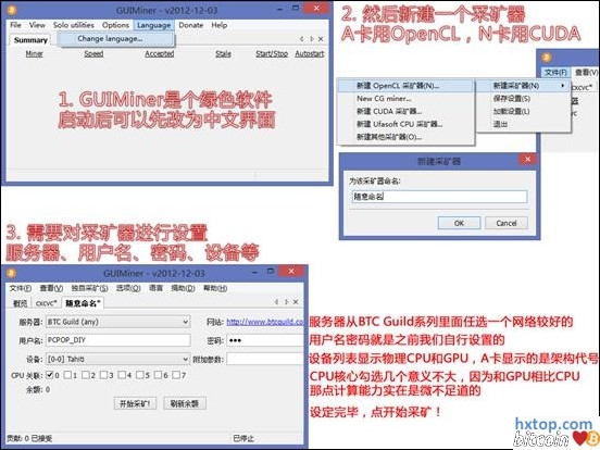 比特币挖矿器GUIMiner还需要做一定的设置,界面改为中文后,就很简单了。 服务器就是之前我们选的BTC Guild,可以随便选一个,试试看哪个网速好就用哪个。 用户名密码也是自己设定的。 设备选GPU就好,CPU不要选,用CPU来挖矿连电费也赚不回来,核心是否勾选也关系不大。