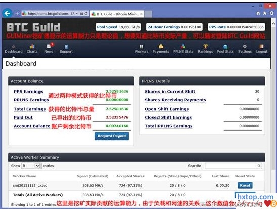 GUIMiner挖矿器显示的运算能力只是理论值,想要知道比特币实际产量,您需要登陆矿池网站也就是BTC Guild监控自己的账户信息。 可以看出,笔者的这个账户之前通过PPS模式已经赚到了2.5个比特币,并且全部导了出来。 当前用HD7870挖矿的实际运算能力是306MH/s,比客户端显示400MH/s的速度低了不少,在最近两个小时内挖出来的比特币只有0.0025个。 下接第二页 |