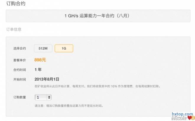 不过,我在今天看到了一个名为DigCoin的网站,就希望利用云服务的方式去解决这一问题。简单的说,这个网站提供了由ASIC 的蝴蝶矿机和 Avalon 矿机组成的矿机阵列,用户只需在网站上购买自己选择的计算能力就能利用矿机阵列的能力进行挖矿。现在的价格是1Ghash/s为898元人民币一年,512Mhash/s为468元人民币一年。
