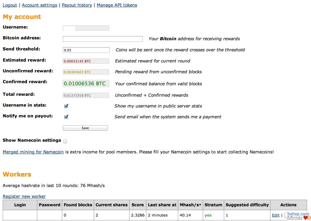 在线钱包界面 2. 加入一个集体挖矿地 要协作挖矿,就得加入一个已经有比特币矿山的集体挖矿地(Pool)。目前最著名的集体挖矿地有Slush’s Pool、 BTC Guild。这些集体挖矿地之间的区别是每个矿山的手续费和人数的不同,以Slush’s pool为例,这家的手续费为每矿山2%。通常人数多的挖矿聚集地的收费费较低。 但这其中存在一个问题:你无法监控集体挖矿地的经营者是否公平的分配得到的财产。Slush’s pool的经营者称:“理论上来说,我可以把挖到的25个比特币全部据为己有,但我不会这么做的。你可以选择相信,或者不相信,但到哪个集体挖矿地是你的自由选择。比特币就是这样的一种自由的产物。” 简单起见,以Slush’s Pool 为例。首先创建一个登陆账号,并且创建工作进程。在本文的演示中,创建了3个工作进程,打算一个用在iMac上,其余的2个用在旧的PC上。 这一过程有点像大型的网络游戏,只要加入就可以开始了。