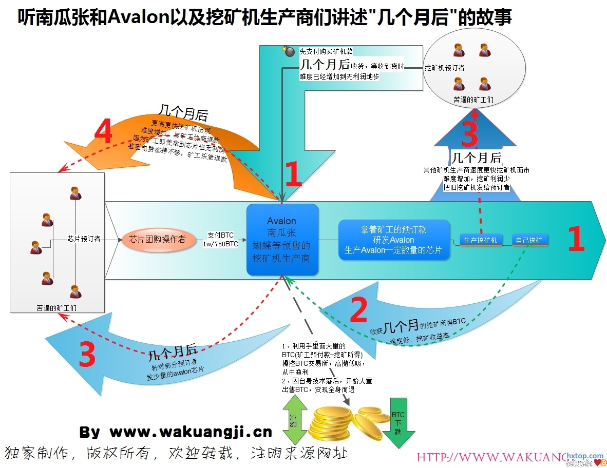 比特币几个月后的故事 1、先收取矿工们预订芯片或者挖矿机的相关货款,这些收取的货款最终绝大部分都是流向了芯片制造商手里,在比特币挖矿行业主要是Avalon。在这一过程中各比特币相关讨论网站中发起团购的人有意或者无意起了掮客的作用。 2、芯片生产商或挖矿机生产商用这些预付款,开始研发芯片、生产芯片或者组装挖矿机 3、组装好的挖矿机和生产好的芯片并不是马上发给预订的矿工,基本上都是留作这些芯片生产商或者挖矿机生产商自己挖矿,然后将挖矿所得的比特币据为己有,因为前期没有大批量对芯片和挖矿机发货,所以挖矿难度并不大,收益丰厚。挖矿芯片生产商为了让广大矿工相信他们已经实际研发出了芯片,针对少量有影响力的挖矿机生产商发了少量的挖矿机芯片,以确保更多的订单跟随。 4、等到挖了几个月后,因为新的挖矿芯片或者其他更高速度的挖矿机面市并发售,这个时候难度基本上增加到了连电费都挖不回来的情况下,挖矿机生产商或者芯片生产商开始将挖了几个月的旧挖矿机发给挖矿机预订者,并开始与芯片预订者协商退款,对于预订了芯片的矿工们来说,因为难度上升速度超过了当初他们预订时候对难度增幅的估计,即使他们现在拿到芯片,再组装成挖矿机,基本上没有利润,甚至还会亏损。矿工也愿意退款 5、这样挖矿机预订者拿到了旧的挖矿机,预订挖矿机芯片的矿工退款。所有的问题都完美解决了。不过就是这些矿工的钱被这些芯片制造商和挖矿机制造商白用了几个月而已,他们给矿工的承诺都是在几个月后。但是在比特币挖矿行业来说。时间是最重要的,投资的收益在几个月后已经被难度上升所冲抵的所剩无几。南瓜张们打的就是这个时间差。用这个时间差成功的实现了借鸡生蛋。 6、在Avalon和南瓜张、蝴蝶等挖矿机生产商们拿着矿工们的预付比特币以及挖矿所得的比特币,可能还投入到了比特币交易中去,通过手里面大量的筹码操纵比特币价格,通过高卖低买的手法从中渔利并维系比特币的高位价格吸引更多的人参与到比特币。最近一段时间他们为了能够顺利的出货,快速拉升比特币价格,大量出售手里面的比特币,达到全身而退的目的,让现金落袋为安。这也是为什么这几天比特币大跌的原因。