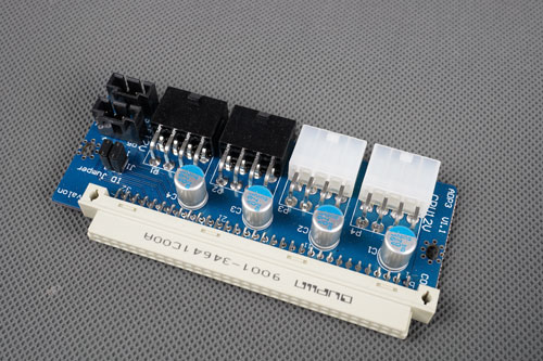 ![]() 每个ADP接口板出厂的时候都是一样的,有4个8P电源接口(2个PCIE8PIN和2个CPU8PIN),任意插上2个口就可以稳定工作,PCIE6PIN也已经足够。除电源口外,还有2个互联的4PIN口和2个ID跳线。
