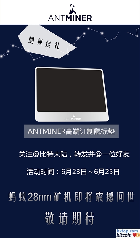 比特大陆发布了BM1382芯片,让许多期待已久的朋友为之兴奋!有关于蚂蚁28NM矿机,我们都在为之努力,若有消息会第一时间公布,也请大家继续关注与支持! 今日活动再次来袭,礼品为ANTMINER高端订制鼠标垫20个,关注转发并@ 1位好友即可参与抽奖。 活动链接请点击:http://weibo.com/3903535942/Bal2P4dRl?mod=weibotime