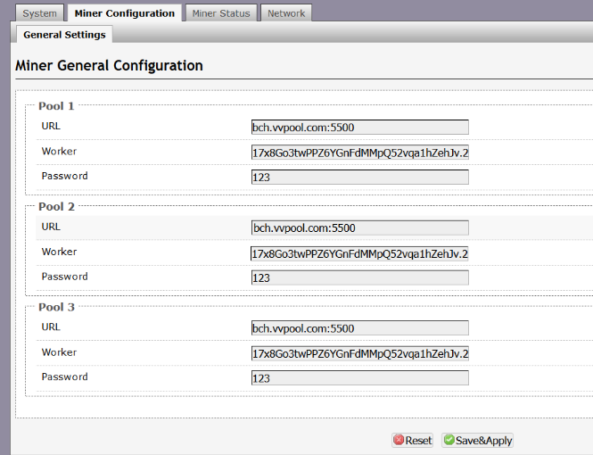 四、设置矿机后台 这个时候我们就进入管理矿机的后台啦,在Miner Configuration/General Settings里,分别设置三个矿池。 URL:填入BCH挖矿地址BCH.vvpool.com:5500(见下图)。 Worker:创建矿工名。格式为:钱包地址.数字或小写字母或两者组合,一台矿机一个矿工名即可。例如:17x8Go3twPPZ6YGnFdMMpQ52vqa1hZehJv.1 17x8Go3twPPZ6YGnFdMMpQ52vqa1hZehJv.23hf24x91 Password:矿工密码(可随意设置)。 将三个矿池设置完成后,点击右下角的"Save&Apply"。