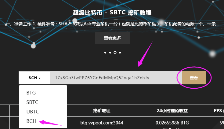 六、VVPool官网监控算力和收益 打开VVPool官网http://www.vvpool.com/,将BCH的钱包地址复制到地址栏,选择币种BCH,然后点击查看:">http://www.vvpool.com/,将BCH的钱包地址复制到地址栏,选择币种BCH,然后点击查看: