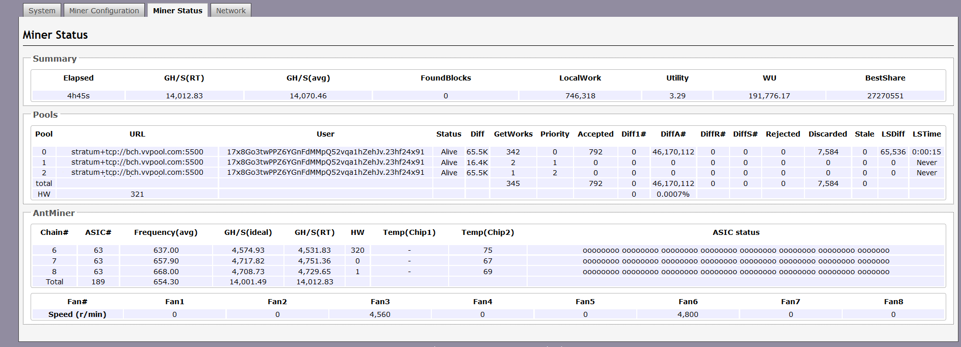 五、查看矿机运行状态 这个时候进入Miner Status(矿机状态),多刷新几次,就可以出现矿机目前的运行情况了。在这里可以看到矿机在默认频率下的运行时间、算力等数据,方便矿工监控矿机运行。
