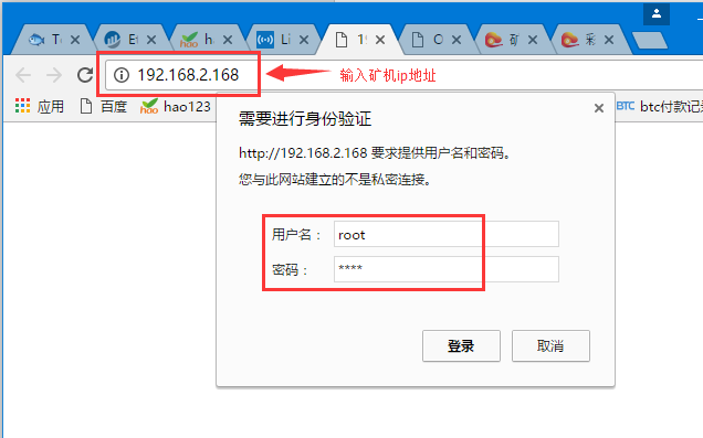打开浏览器,将上边找到的矿机IP粘贴到浏览器地址栏,回车Enter,在弹出的身份验证中,用户名和密码都输入"root",点击确定。