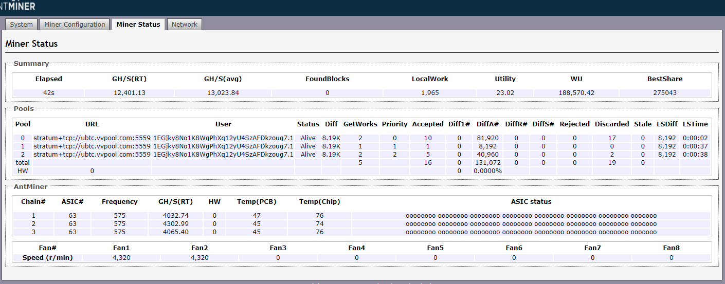 五、查看矿机运行状态 这个时候进入Miner Status(矿机状态),多刷新几次,就可以出现矿机目前的运行情况了。在这里可以看到矿机在默认频率下的运行时间、算力等数据,方便矿工监控矿机运行。