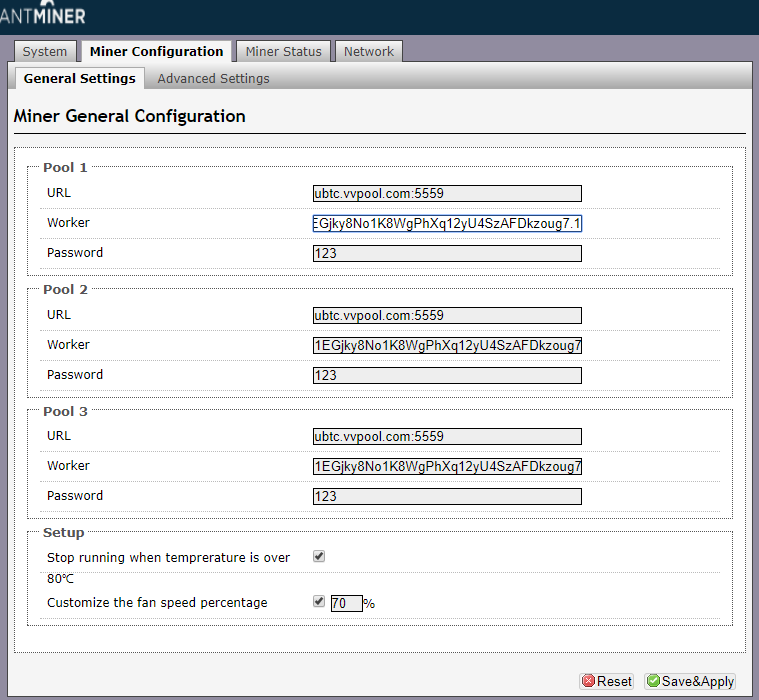 四、设置矿机后台 这个时候我们就进入管理矿机的后台啦,在Miner Configuration/General Settings里,分别设置三个矿池。 URL:填入UBTC挖矿地址ubtc.vvpool.com:5559(见下图)。 Worker:创建矿工名。格式为:钱包地址.数字,一台矿机一个矿工名即可。例如:1EGjky8No1K8WgPhXq12yU4SzAFDkzoug7.1 Password:矿工密码(可随意设置)。 将三个矿池设置完成后,点击右下角的"Save&Apply"。