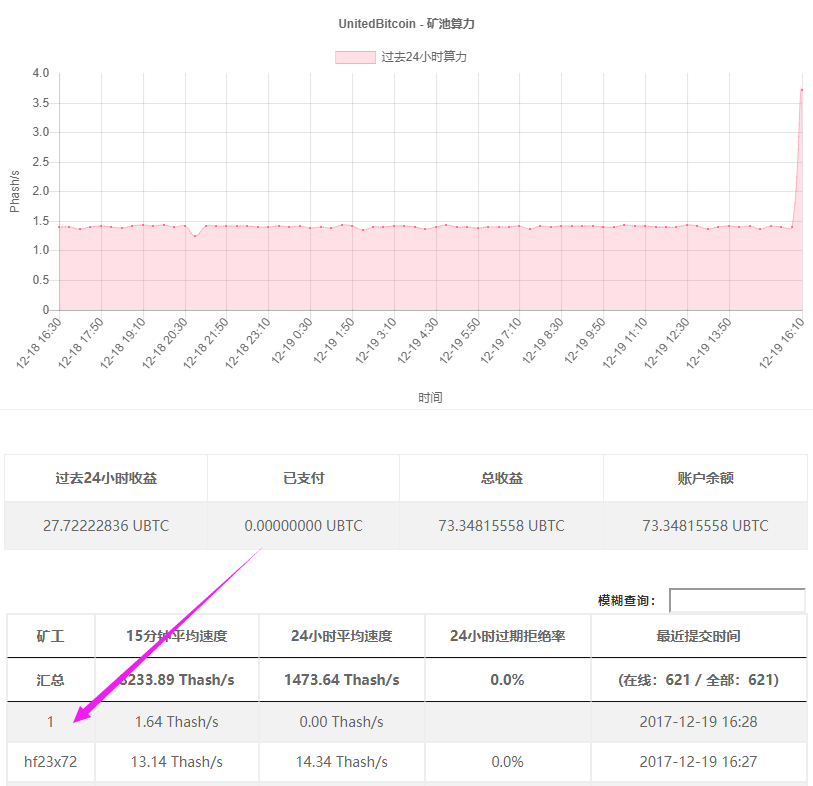 六、VVPool官网监控算力和收益 打开VVPool官网http://www.vvpool.com/,将UBTC的钱包地址复制到地址栏,点击查看: