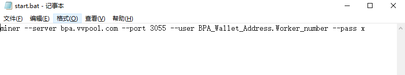 右键点击"start.bat",选择编辑: 打开如下窗口,各项参数如下图所示。设置BPA挖矿,需要检查矿池地址,并设置矿工自己的BPA收币地址和矿工号。如果有多台机器,矿工号是为了区分不同的机器,那个点不要漏了。在修改的时候只把对应的字符改掉,空格、标点不要删,修改完成之后点保存。