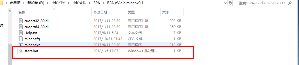 跟ETH、ZEC等币种挖矿类似,使用显卡挖BPA时,首先要有一个BPA的收款地址。获取BPA钱包的方法http://miner.tools/portal/article/index/cid/20/id/130。 因为BPA用的挖矿算法与ZEC相同,所以挖矿软件暂时跟ZEC也是一致的。 如果没有用ZEC挖矿过的话,可以通过如下链接获取: 链接:https://pan.baidu.com/s/1qXTmgqw 密码:7n83 (N卡矿工软件) 链接:链接:https://pan.baidu.com/s/1o865WaI 密码:qj5j (A卡矿工软件) 1)N卡挖矿获取到挖矿软件后,解压缩挖矿软件,找到"start.bat"文件。