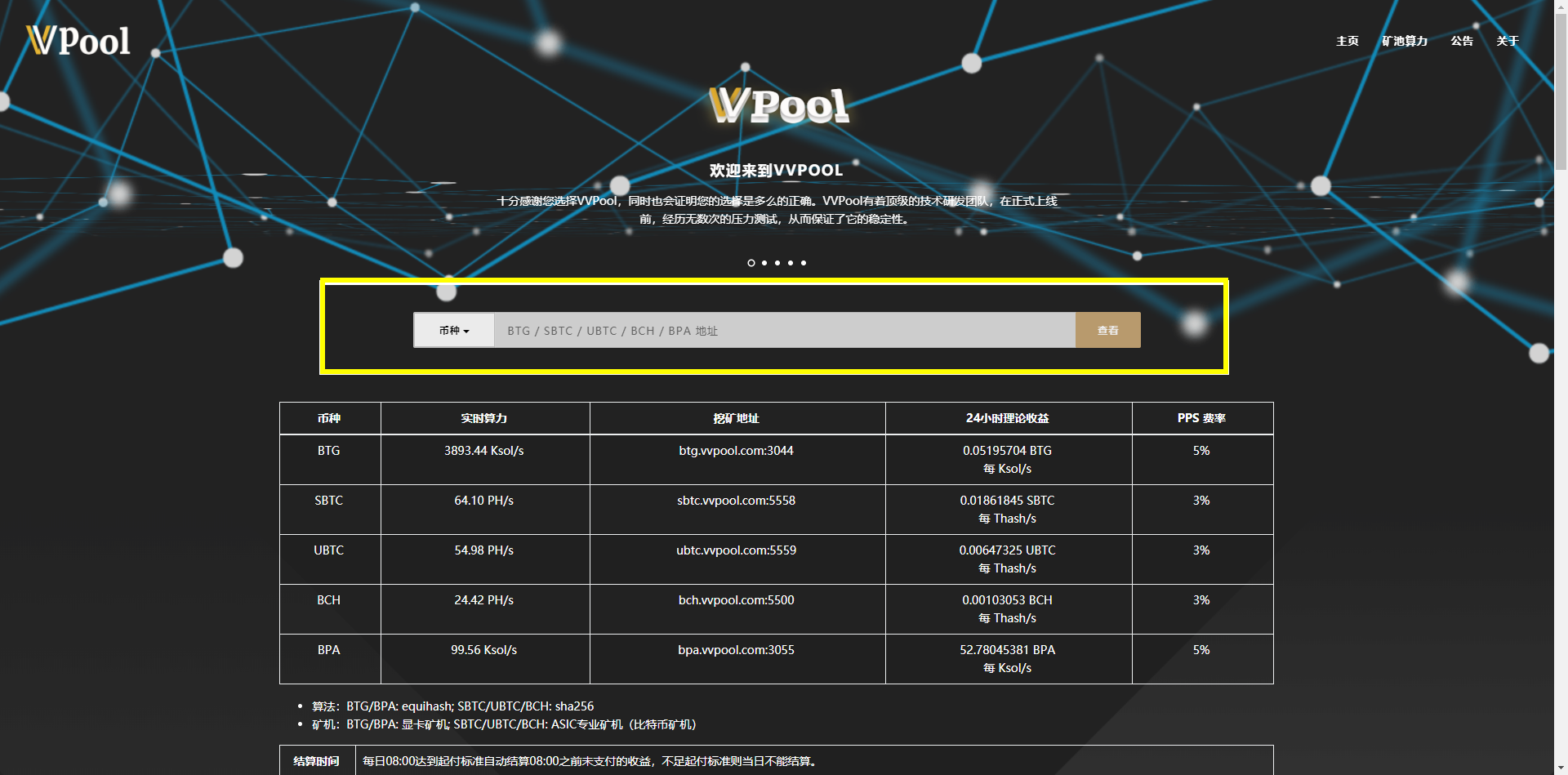 需要注意,BPA的A卡矿工软件,刚刚从ZEC升级过来,矿工软件中,显示的币种仍是ZEC,这个没影响。只要出现算力,如上图中Total Speed:859.319H/s,类似字样即可。 查看BPA矿机运行状态和每日收益,可以通过访问VVPOOL官网进行查看。 访问地址: http://www.vvpool.com/address_stats