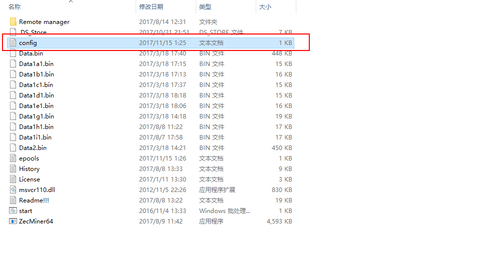2)A卡挖矿获取到挖矿软件后,解压缩挖矿软件,找到"config"文件。