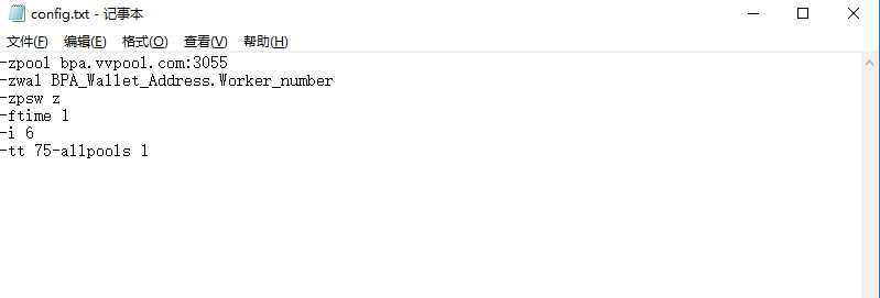 双击,打开文件,如下图所示,检查BPA矿池地址和端口号,并设置矿工自己的BPA收币地址和矿工号。如果有多台机器,矿工号是为了区分不同的机器,那个点不要漏了。在修改的时候只把对应的字符改掉,空格、标点不要删,修改完成之后点保存。