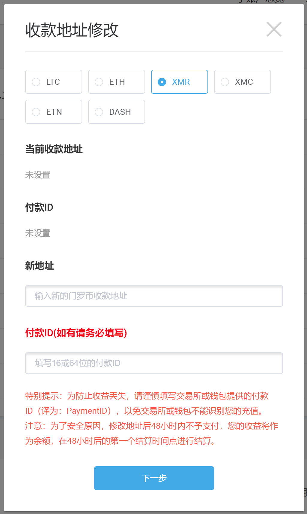 6.最最重要的!登录币印矿池,设置收款地址 若交易所或钱包提供的地址包含付款ID(英文:payment ID),请务必将付款ID填写到币印的“付款ID”处。
